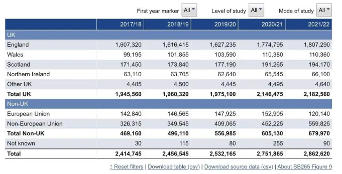 根据HESA发布的2021/22学年数据显示: